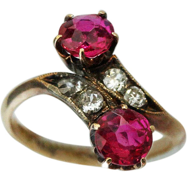 Antique Victorian ring. Crossover rubies and diamonds mounted in 18ct yellow gold. Made circa 1880's.