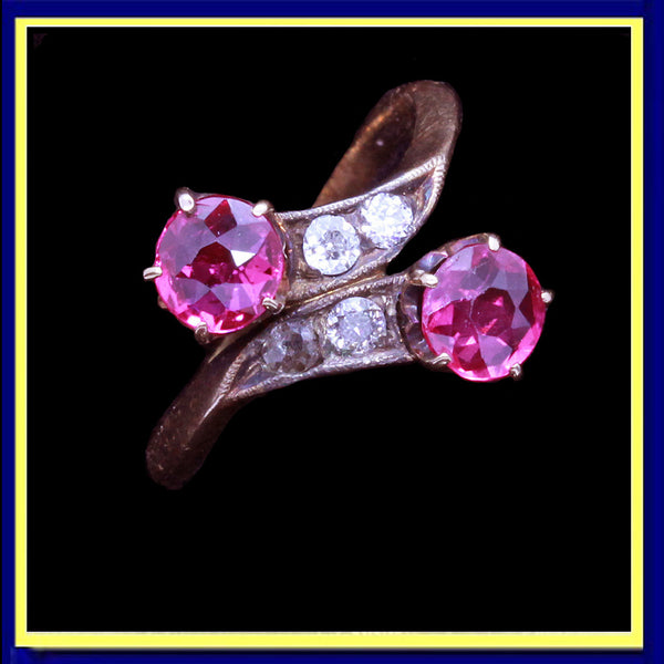 Simple gold band twists at the shoulders so that the two sides pass each other / cross over each other. Set with a pair of diamonds on each side and terminating in a lovely bright pink ruby. Rubies have tremendous sparkle and delightful deep pink tone.