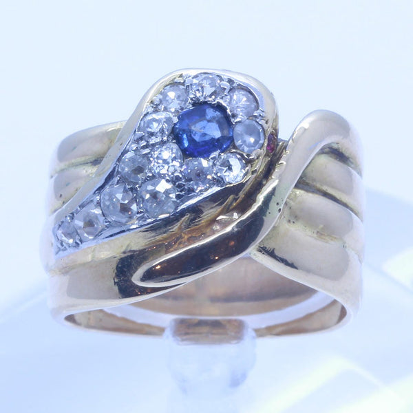 Description : A large snake with no less than 4 coils forming the shank of the ring. The final band coiling around the head. The head is beautifully pave set with rose cut diamonds and a deep blue sapphire. Perfect for any occasion and especially as an engagement ring. (Queen Victoria had a snake engagement ring similar to this one).