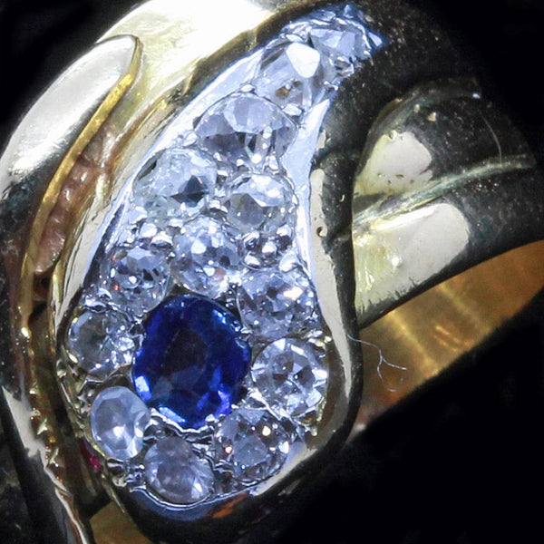 Antique Victorian Napoleon III snake ring. 18k yellow gold, sapphire and diamonds. Made in France, circa 1850-1870.