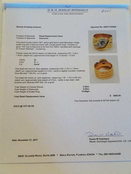 The two small pink sapphires mentioned in the appraisal are the eyes of the snake. They are very small and difficult to see in the pictures.
