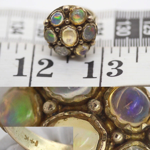 Opals display a glow of every color in the rainbow, depending on the angle that light catches them. Move slightly and the color of each stone changes from clear to deep greens, blues, oranges and yellows. A fascinating ring that makes quite a large statement.