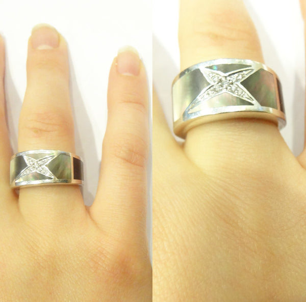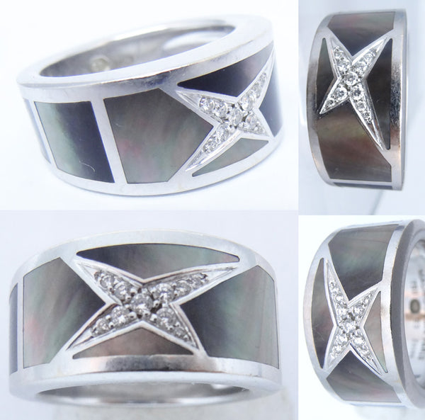 Description: Estate ring. Divine Star Ring can be worn as a wedding band, as it is full of symbolism of love and beauty, featuring the popular Maugoussin star as well as mother of pearl, set in white gold. The band tapers slightly towards the back of the finger and broadens imperceptibly towards the middle/top, where the star is inset. The borders are clean white gold. From shoulder to shoulder, the band is inset with panels of mother of pearl with wonderful luster, flashing colors from silvery-white to deep grey and brown, depending on the angle that the light catches it. The top of the ring is inset with a 4-sides star, assymmetric arms stretch across the surface. The star is very finely set with diamonds, within a white gold border. Subtle and elegant. Very beautiful workmanship. Double meaning of the star as it is also the logo of Mauboussin, one of the best French jewelry houses since 1827.