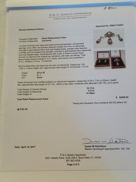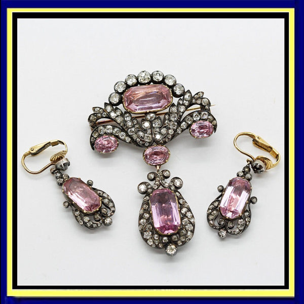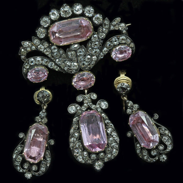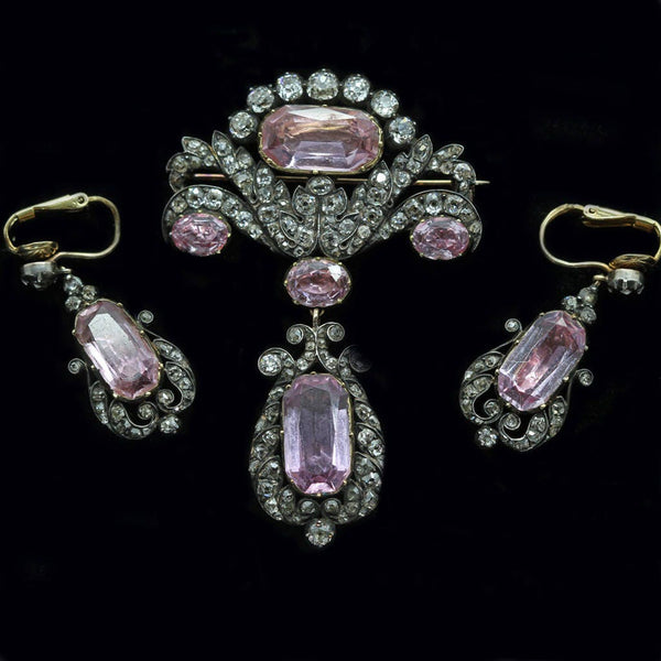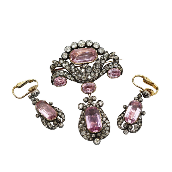 Description: Demi Parure consists of a matching pair of earrings and a brooch-pendant that can be worn either as a brooch with both or upper part or seperated and worn as a brooch and pendant or two pendants. Made of matching pink topaz, richly surrounded and highlighted by diamonds. As was the custom at the time, diamonds are set in silver, backed in gold.