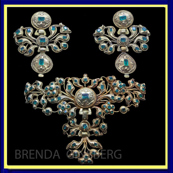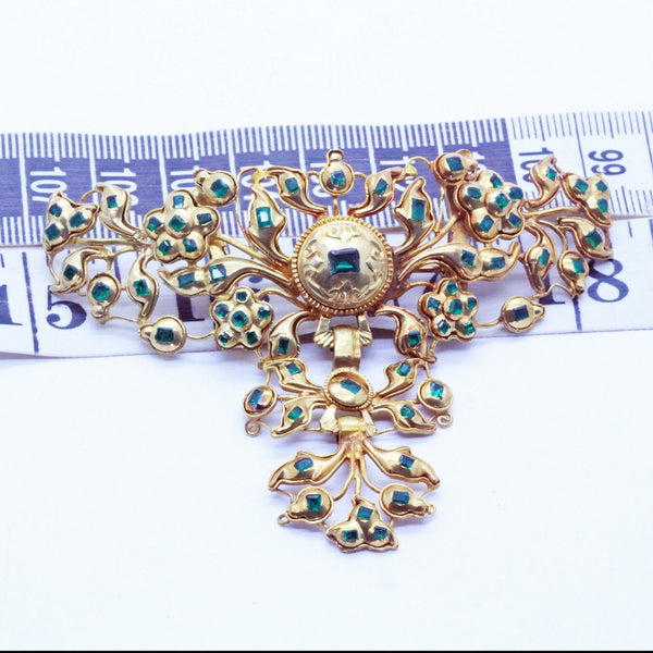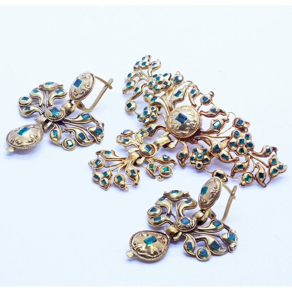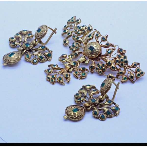 Antique Georgian Iberian jewelry set parure consisting of a pair of earrings and a brooch / stomacher. 18k gold and emeralds. Made in Spain circa 1750-1810.