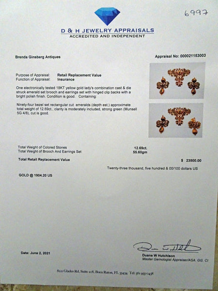 Measurements: Brooch weighs 30.1 grams. Earrings weigh 25.7 grams. Total weight is 55.8 grams. Brooch is approximately 3 1/4 inches (a little over 8cm) across. Brooch approx 2 3/8 long. Earrings are approximately 1 1/2 inches across (4cm) and 2 inches long. 12.69ct emeralds.
