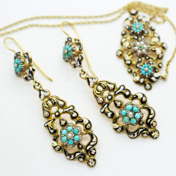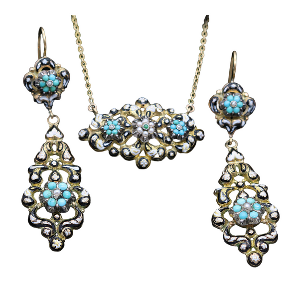 The pendant necklace has the same openwork decoration of scrolling gold with black and white enamel adornment. A trio of flowers in a row echo those above, with the central flower reversing the turquoise and pearl to a pearl surround and turquoise center. The pendant may have started off life a little differently. Gold work on the back shows that it probably hung vertically in its original form as a large loop has survived. The pendant is attached to a later gold chain.