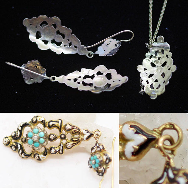 Description: As amazingly wearable and attractive today as they were 200 years ago. The earrings are in two sections - the upper surmound somewhat flower-shaped with an outer, scrolling border of black and white enamel encircling a raised turquoise and pearl flower. The surmount is linked via loops to the long, kite shaped drops, which dangle, swing and sway as the wearer moves. The same black and white enamel in a lovely openwork design with black and white enamel on gold, beautifully sets of another, slightly larger turquoise and pearl flower. A very big look and will certainly catch every eye, yet light and comfortable to wear.