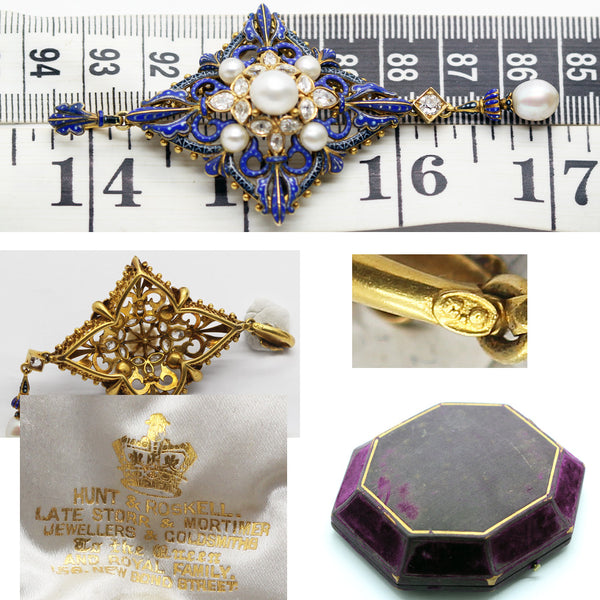 Marks: Bale of pendant with oval mark for Carlo Giuliano (CG). Gold was acid tested to ensure metal purity. The box has an embossed gold crown above rich gold lettering HUNT & ROSKELL Late STORE & MORTIMER JEWELLERS & GOLDSMITHS TO THE QUEEN AND ROYAL FAMILY. 1.56 NEW BOND STREET.