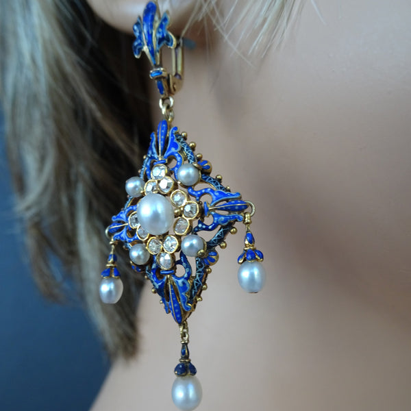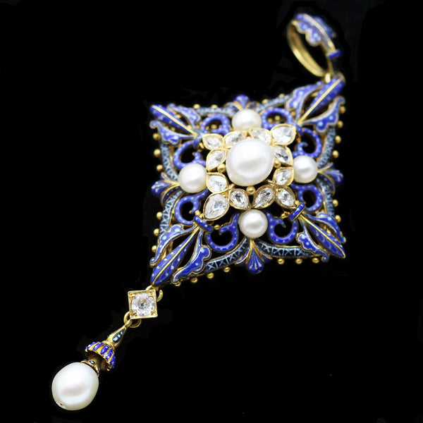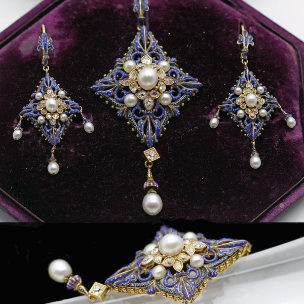 Description: Matching pendant and earrings. Elongated fleur de lis foliage surmounts suspend diamond-shaped drops. The openwork gold is richly enamelled in deep, bright blue with white detail. The scrolling openwork rises towards the center, where rings of colette-set diamonds surround central pearls and more pearls are placed at each corner. Pearls are all believed to be natural. The earrings have drops from both sides and the bottom corner and the pendant has a matching, larger drop at the bottom. The pearl drops are enclosed, like budding flowers, in blue enamel calyxes. A diamond in a square gold colette lies betwen the large pearl drop of the pendant and the central body of the piece. Magnificent gold work, even at the back, with a gallery with gold granulations and as beautiful as the front. Pearls with exquisite luster; enamelwork and design are superb and closely related to the Holbeinesque Neo Renaissance style for which Carlo Giuliano was known. True museum quality.