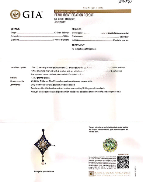 Measurements: Pendant is a little under 3 1/2 inches long (8.5cm). Earrings a little over 2inches (5.5cm) long, not including the wires. Combined weight is 28.9 grams. GIA measured largest pearl as 8.05 X 7.33mm (and oval and white in shape and color).