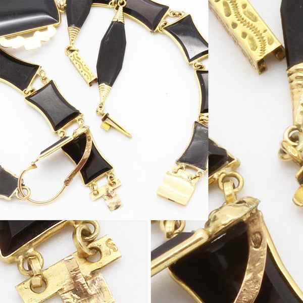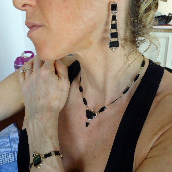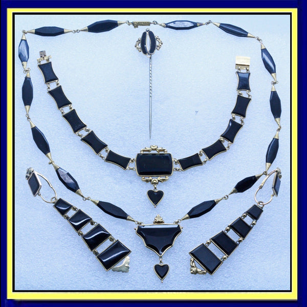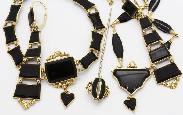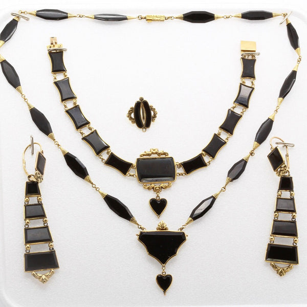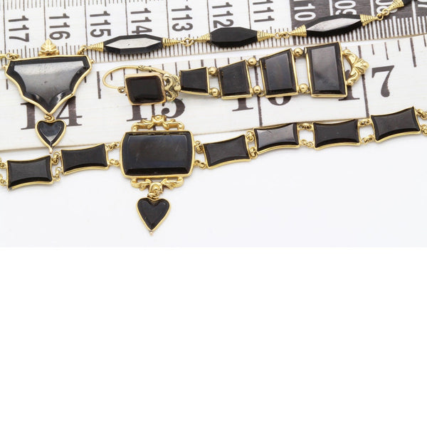 Astonishing to find a set of this age survive close on 200 years intact. Composed of finely carved and polished black onyx set off with beautifully moulded 18k yellow gold. The necklace has elongated navette shaped faceted links, their terminals wrapped in coils of gold and connected by small round links, enabling flexibility. The center of the necklace is a badge or shield shape suspending a small black heart, all set in gold and perfectly matching the rest of the necklace. The bracelet has flat, concave rectangular onyx links that reflect the shield of the necklace and also suspends a small heart, identical to the one on the necklace. The center of the bracelet is mounted in repousse gold with foliage and flowers. The long dangle earrings match the necklace and bracelet with their gradated rectangular links: beginning with a square and enlarging and widening towards the bottom. The links are seperated from each other by gold mounts, giving the impression of a very luxurious ladder. The links allow for movement. The same repousse work mounts the earrings. The earrings are long pendants and extremely elegant. The top and bottoms can be seperated and can be worn alone or seperately. These are called top/drop or day and night earrings since the simpler surmounts would be worn alone by day and the whole, more elaborate pendant could be worn at night. Earrings close from back to front, typical of Victorian jewelry. Matching pin in 18k gold with a metal stick. The heart theme that recurs in this set is a gentle hint of the love of the person wearing the jewelry to both the giver and possibly, the person who was lost. Victorian jewelry was full of symbols, most of which we have forgotten. Good quality workmanship. The fine way the onyx is cut indicates a top quality, sophisticated manufacturer. The understated gold work similarly reflects the high quality of the jewelry maker. The black and gold mourning color combination is stunning and no less fashionable and wearable today as it was before 1860. The tongue in groove clasp of the bracelet is secure as is the engraved box-clasp of the necklace. Mourning fashion was dictated by society during the 19th century and black, mourning jewelry was the only color permitted for one who had recently lost a loved one. This did not preclude the fabulous taste and aesthetics of the jewelry. Today, we would wear black and gold as the ultimate in elegance.