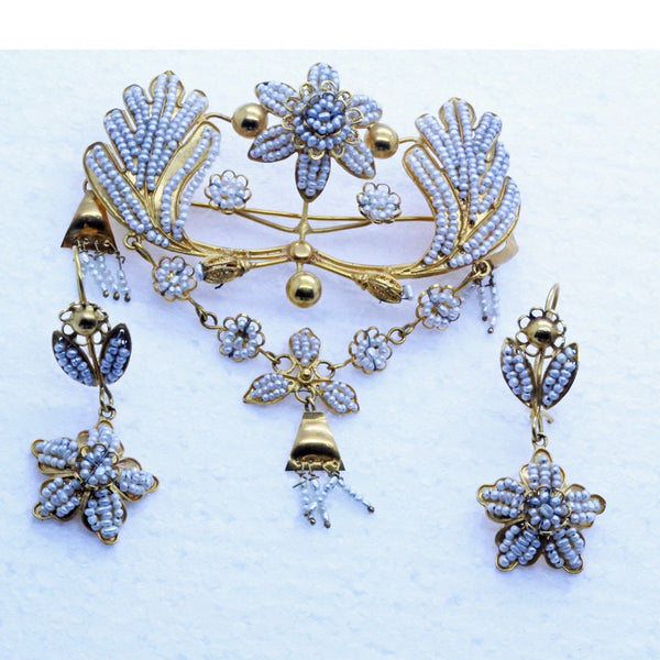 Antique Victorian parure jewelry set consisting of dangle drop earrings and brooch/pendant. High carat gold (see below) and small natural seed pearls. Made in Southern Italy, 19th century. Bridal jewelry.