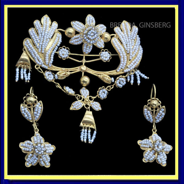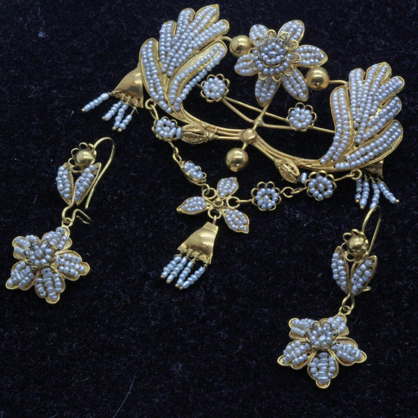 Description : Typical of southern Italy and especially Sicily, the set is beautifully made and highly versatile for any wearer today, in particular, suitable for a bride. Earrings consist of two parts that easily seperate by simply slipping the bottom off the surmounts. This was called 'Top Drop' or 'Day Night' jewelry - it could be worn more simply with top only by day or, more elaborately with top and drop, by for more elegant occasions. Strong floral theme. The surmounts consist of a golden globe surrounded by gold wirework forming a flower amidst a pair of elongated leaves, entirely set with small pearls. Wires are easy to insert and comfortable to wear with c-hooks to further secure them. A loop connects the drops to the wires of the top. Drops in the form of flowers, also richly set with pearls, another, smaller, pearl-set flower in the raised centers. Drops swing and sway freely as the wearer moves. Brooch or pendant is large, but very delicately designed. Large leaves surround a central big flower of different levels, rising well above the surface. Smaller flowers like brides-maids on golden stalks beneath it. Filigree buds and golden globules connect the leaves. A swinging wreath of flowers and fringes adds depth and a lot more interest and movement. The back has a hinged pin with c-clasp and the wires supply varied options for using as a pendant. Simple wires, hidden mainly in the back, help to hold the pearls in place. Extremely fine workmanship. Very delicate, feminine adornment.
