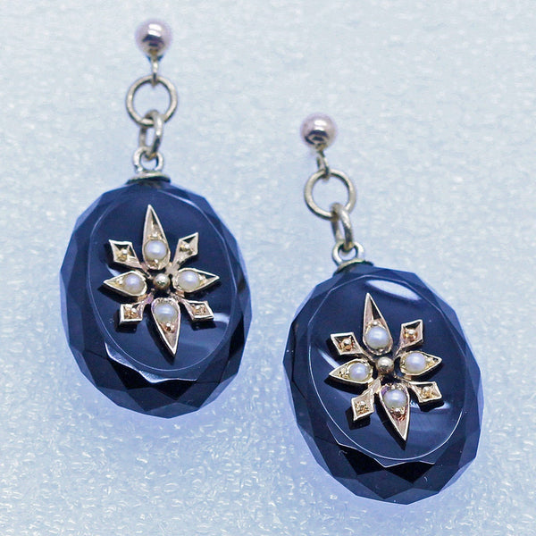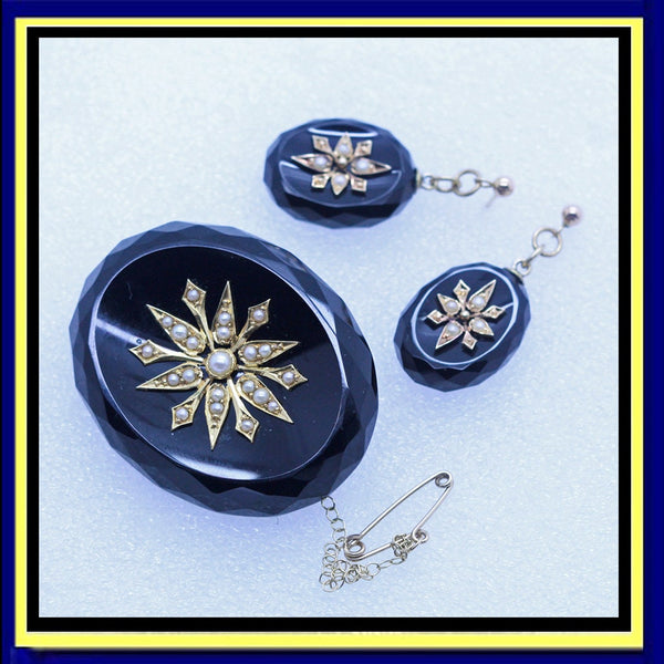 Description : Pair of earrings or ear pendants and a brooch made of carved black onyx, very finely set with gold-mounted small pearls. Oval in shape with faceted sides and slightly convex on top to house a radiating star or flower of gold, set with pearls and small golden globule details. Centers are slightly larger pearls. Black, white and gold contrast and play off each other giving a rich and luxurious effect. The brooch with c-clasp and an added safety chain with safety pin. The earrings with small globular surmounts, which might be later additions, gold loops and onyx drops. The gold loops allow the earrings to swing and sway as the wearer moves. While the black, white and gold colors and materials are fittingly sober, understated and suitable as mourning jewelry, the combination of design, contrasting colors and continuous movement draw attention in a very subtle way. Originally worn as mourning jewelry, this jewelry is now sought after for it's elegance and fine workmanship. Classically beautiful, this set can be worn by anyone with any outfit.