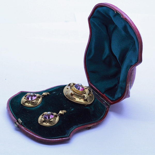 Earrings are suspended from loops beneath surmounts that echo the Gothic-like shapes linking other sections. Gold granulation adds interest and is typical of the Revival period, as does the rope-twist filigree. Earrings swing freely as the wearer moves so that light continuously catches the amethysts and plays with the tone and color of the stones. Long gold wires are easy to insert and comfortable to wear.