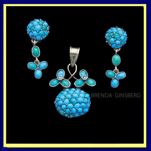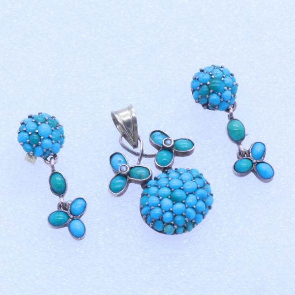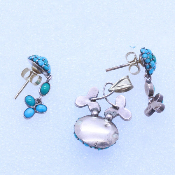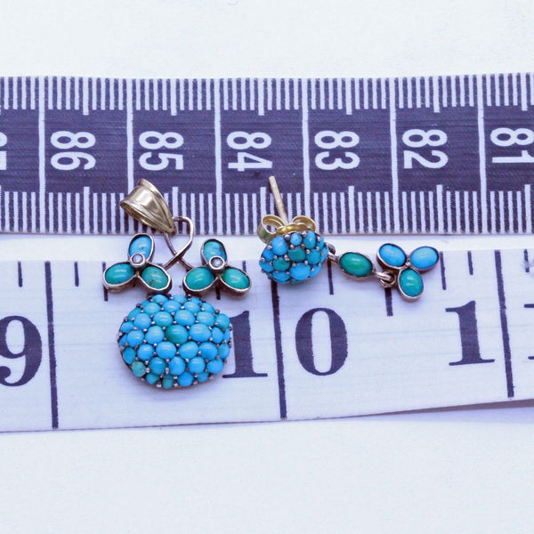 Description : Small earrings and pendant. Earrings consist of round disks entirely pave set with turquoise cabochons, slightly raised towards the center, like a flower. Connected by tiny gold links are small oval cabochon turquoise fowers, that can move independently of the surmounts, swinging and swaying as the wearer moves. Matching pendant with larger, round flower drop below a pair of smaller turquoise flowers with tiny pearls in their centers. Generous gold bale and posts are later replacements, which is typical of Victorian jewelry and makes it easier for the modern woman to insert and wear. Highly wearable for any woman, including a young girl, this small set is classic Victorian. The Victorians adored turquoise jewelry, which suits every complexion and age. Very pretty, versatile set.