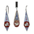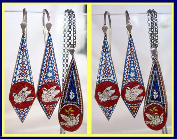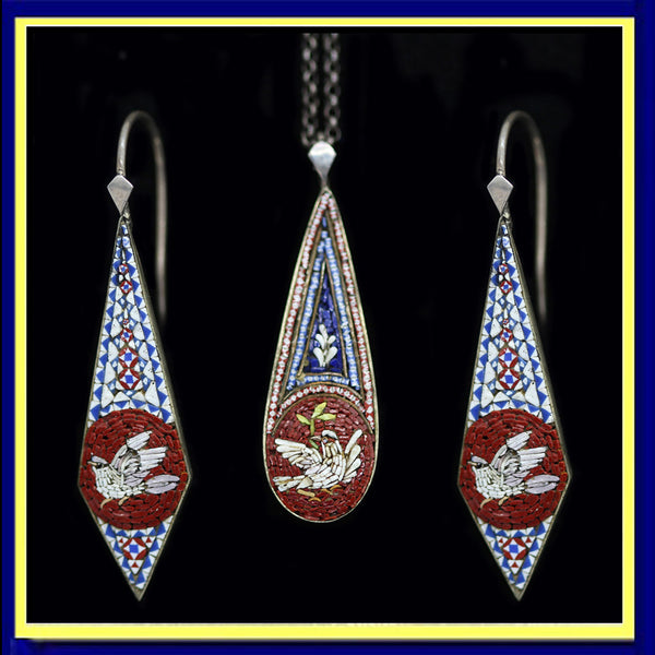 Earrings are elongated kite shaped; pendant similarly elongated, but round at the bottom. Backgrounds of red, white and blue. The widest part of each item has a round reserve with deep red tesserae in which a white dove flutters. The dove on the pendant holds an olive branch in it's beak. Fine detail from eyes to subtle variations of shade in the colouring. Set in silver-coloured metal.