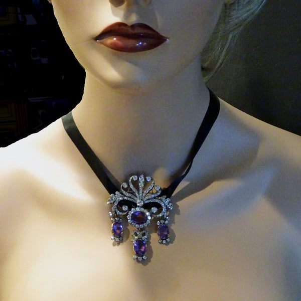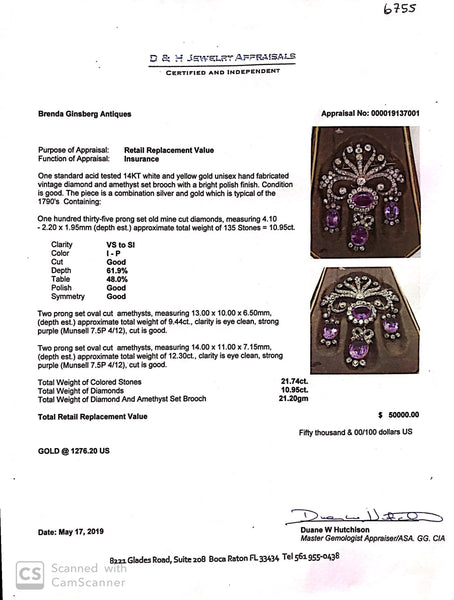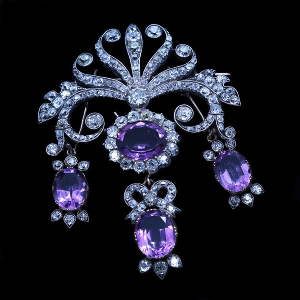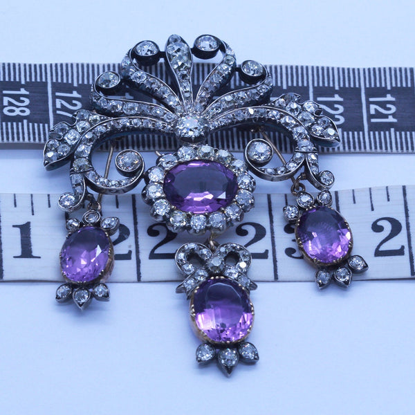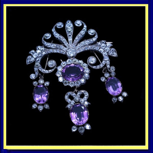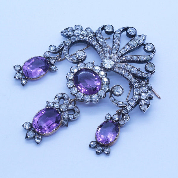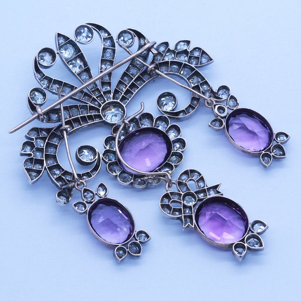Description : Scrolling, tiara shaped surmount of diamonds like a setting or rising sun, with rays of waving ribbons or arms, scrolling up and down in sensuous and serpentine curves, with foliage theme on the sides. A larger diamond is set in the center at the bottom of the surmount, from which a large oval amethyst surrounded by a border of closely set rose cut diamonds in turn suspending a drop with a bow of diamonds, foliage of diamonds and center of oval amethyst. On either side are matching amethyst drops with diamond accents, the whole in a girandole design.