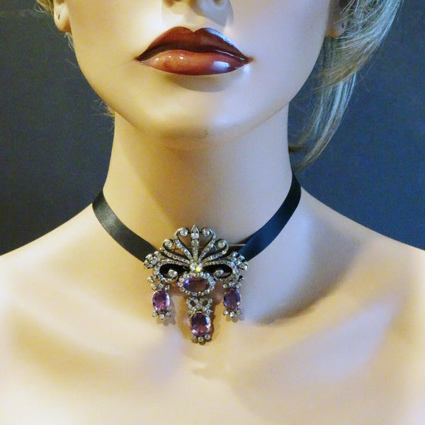 The 3 drops of the girandole can be removed. They are attached via long wires and loops. The outer pair of amethysts can be worn as earrings (wires are not present) and the central drop as a pendant. Simple c-clasp.