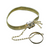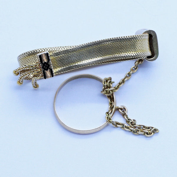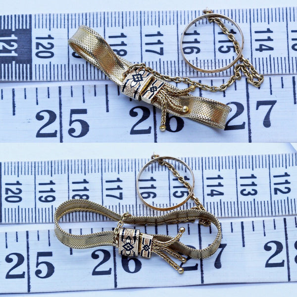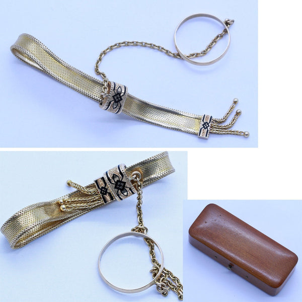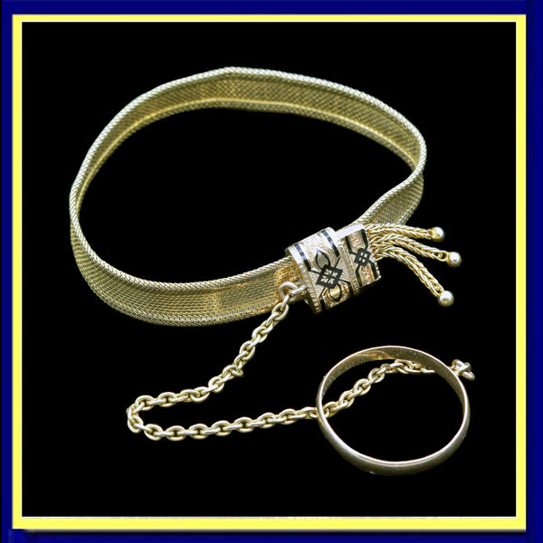 Description : Bracelet and ring connected by a gold chain, made for a child. The ring is a simple gold band, like a plain wedding ring. The chain that connects it to the bracelet is very sturdy and made of strong, tightly fitting rounded rectangular links. The bracelet is superb - composed of very finely fitted gold links that make the band totally supple and luxurious - like golden silk. A gold slide and stopper are enamelled in black - whether for mourning or fashionable reasons, we do not know. By moving the slide away from the stopper, the size of the bracelet is decreased; by moving it closer, there is more space for a bigger wrist/arm. Fringes on the end of the stopper are typical of Victorian jewelry of the 1860's.