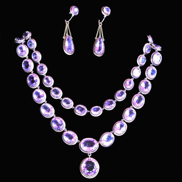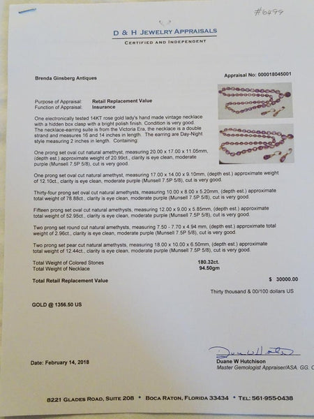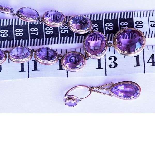 Description : Height of classic elegance and understated beauty. The set consists of a rare double riviere - two co-joined necklaces and a pair of long, day - night or top - drop long dangling earrings. Each link of the two parts of the necklace that falls beautifully at the nape of the neck, is composed of a flat-topped, gently faceted amethyst, all well matched, set in a decorative collete within a gold outer frame at right angles to the stone. Gradation with largest stones in the center and the largest of all being a drop in the front center. Tongue in groove clasp. Small gold loops connect amethyst stations. Earrings can be worn with tops and drops together or the smaller tops alone by day. They are inserted into the ear from the back, which is how Victorian earrings were made. The top wires thread through a gold loop that suspends a triple chain from which an elongated pear-shaped amethyst drop, mounted as the links of the necklace, is suspended. The chains cause the drops to swing and sway as the wearer moves. > The ultimate in quiet elegance, this set could easily be worn by a queen. The workmanship is very strong and sturdy and beautifully done.