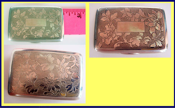 Rectangular box with hinged lid and thumbpiece in front. Unusually decorated both top and bottom. The top of the lid has a rectangular reserve, intended for the owner's initials, but still vacant. It is surrounded by beautifully chased peonies / chrysanthemums on a stippled, textured ground. The bottom is similarly chased with flowers and foliage.