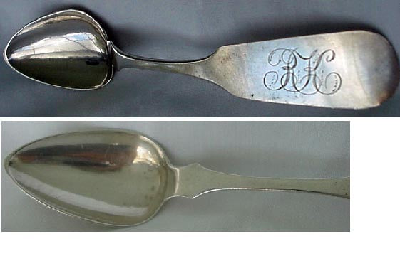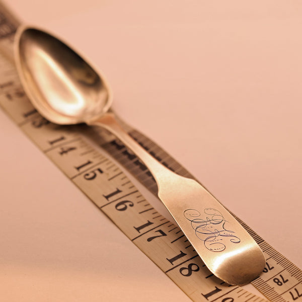 Fairly large spoon with kite shaped neck and u-shaped drop at the back. Narrows to a long central portion of the handle and widening to a broad section towards the end of the handle. This large flat section is bright cut engraved and has ornate monogram of intertwined letters. (Possibly B T C).