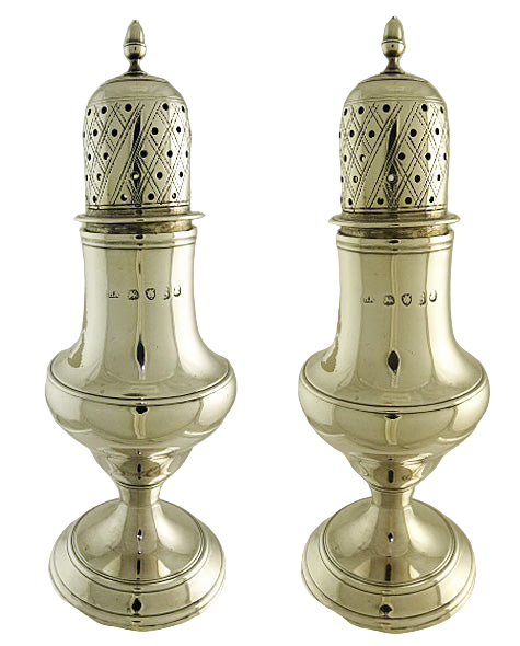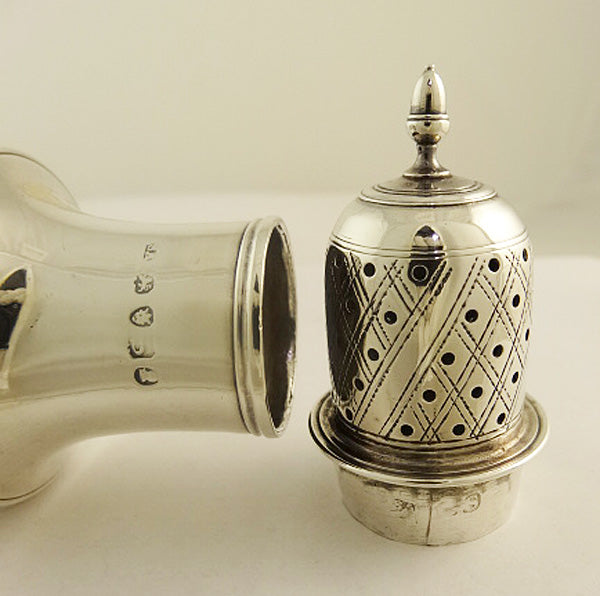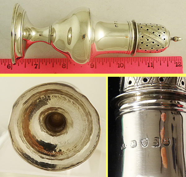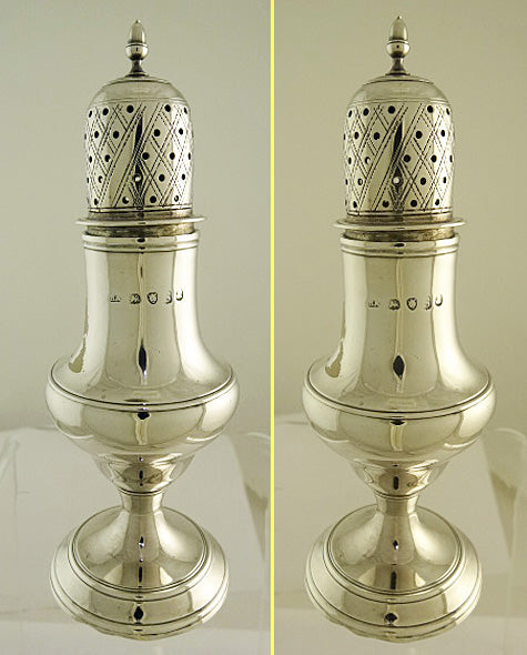Very elegant caster. Baluster shaped standing on round foot. Narrow shaped leg. The cylindrically shaped top with a domed roof and beautiful acorn finial. Top pierced with each hole in a double engraved diamond shape. Besides the ridges of the silver and it's beautiful shape, there is no further decoration.