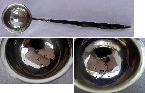 Inside the bowl is hallmarked in a circle or ring around the maker's mark, EM. Lion, Leopard head crowned, date letter B. (for sterling silver, London, and 1797).