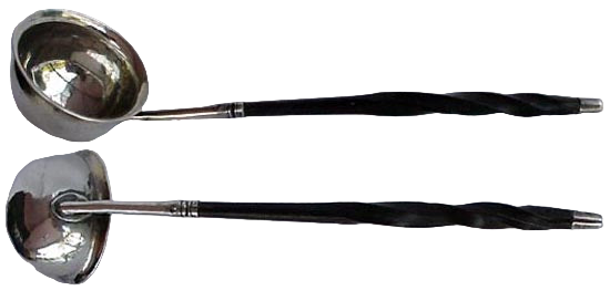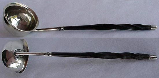 Deep, full round sterling silver bowl. Perfect for serving or dishing up anything, especially liquids. Serve food or punch or wine. Connected at the back to a silver, slightly tapering holder containing a silver tipped, twisted whale bone extended handle that will not conduct heat if the drink/food being served is hot. Beautifully crafted with rich look.