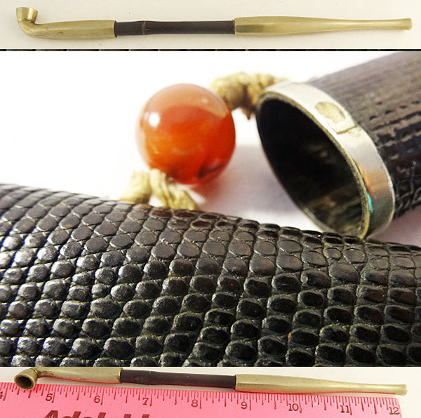 Condition: the inside of the pouch is very worn. The outside of the pouch is in remarkable good shape with the exception of a tiny corner of the top left flap (see 'photos). The string holding the amber bead is worn. The amber bead is in very good shape. The lacquer pipe case is in very good condition considering it's age, with minor wear commensurate with age; the pipe is in good shape with minor wear. See 'photos for details.