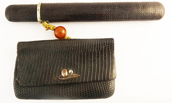 Antique Japanese wallet / pouch Sagemono; Kiseru smoking pipe and Kiseruzutsu case for smoking pipe w Shakudo clasp. Made during the Edo or Meiji period, over 100 years ago.