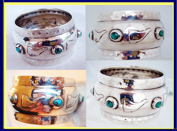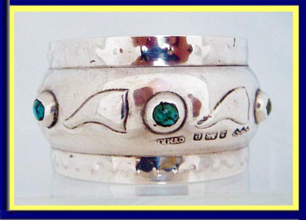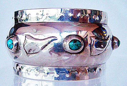 The wider, central portion has a ring of alternating raised silver adornments and colette-set cabochon turquoise.