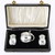 Antique Sterling silver condiment set consisting of salt, pepper, mustard with original blue glass liner, in fitted box. Made Birmingham England, 1932.