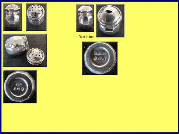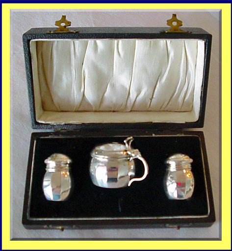 Mustard and salt are hallmarked with maker A.S.P. CO; anchor (for Birmingham), lion (for sterling silver), date letter H for 1932. Pepper is similarly marked but date is J and maker is E.E.