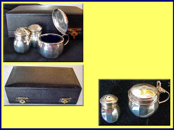Original leather fitted box with silk and velvet lining. Barrel shaped salt and pepper castors. Lids screw on and off easily. Salt has dent at top of lid (see 'photos). Mustard is also barrel shaped, but rounder with delicate handle and strong hinged lid. Small dent on lid of mustard. Original blue glass liner.