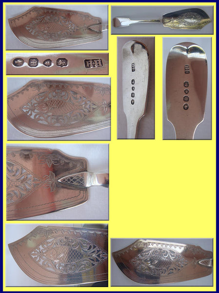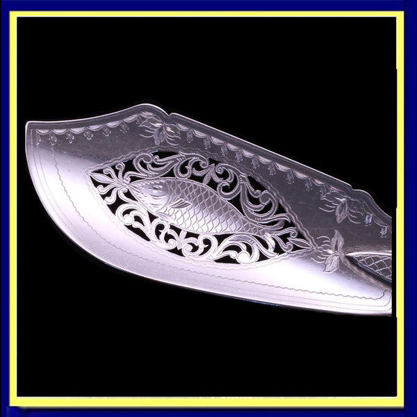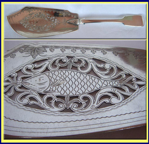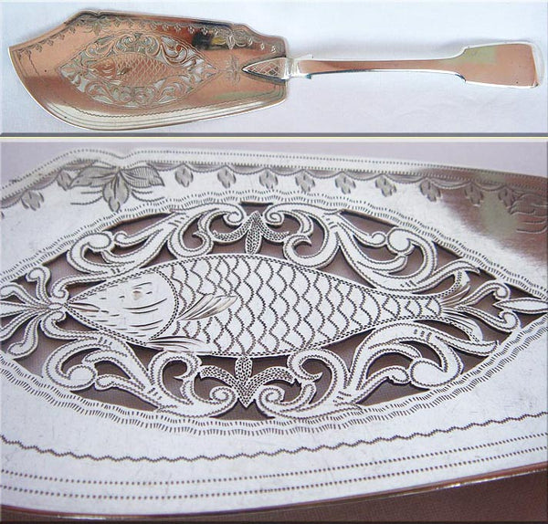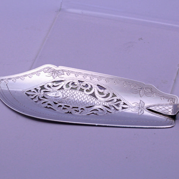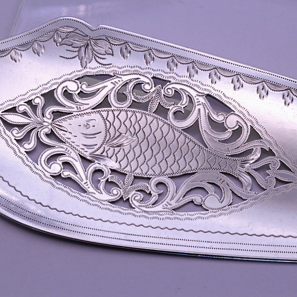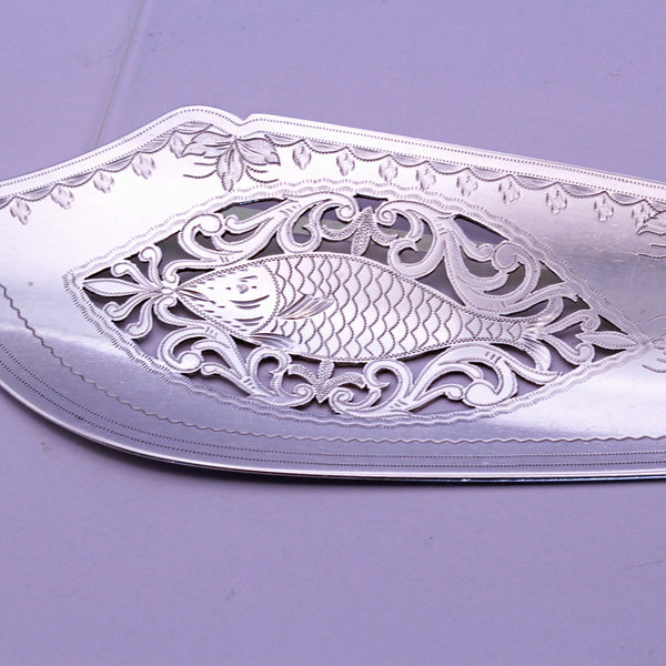 Beautiful fish slice with openwork and engraved decoration all over the blade. A large enclosed leaf-shaped lozenge with a pierced fish motif, surrounded by openwork scrolls. Bright cut engraving border and highlights the different areas.