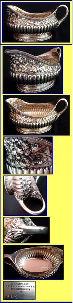 Late Victorian gravy boat with very generous, round shape, fluted sides in the Georgian style with a band of repousse flowers and foliage above it, delicate leaf border and fine floral pattern on the oval foot.
