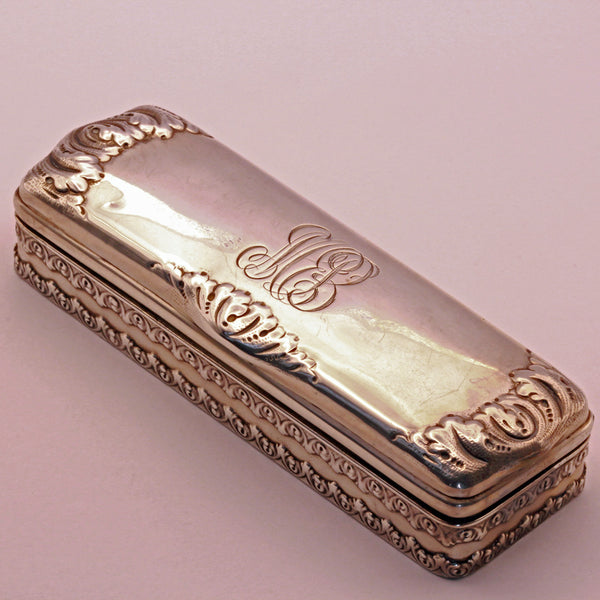 Repousse foliate scrolls on lid in front and sides with engraved detail. Monogram ornately engraved - possibly WEB. A smaller version of the foliate pattern seen on the lid is repeated all the way around the sides of the box, beneath the lid.