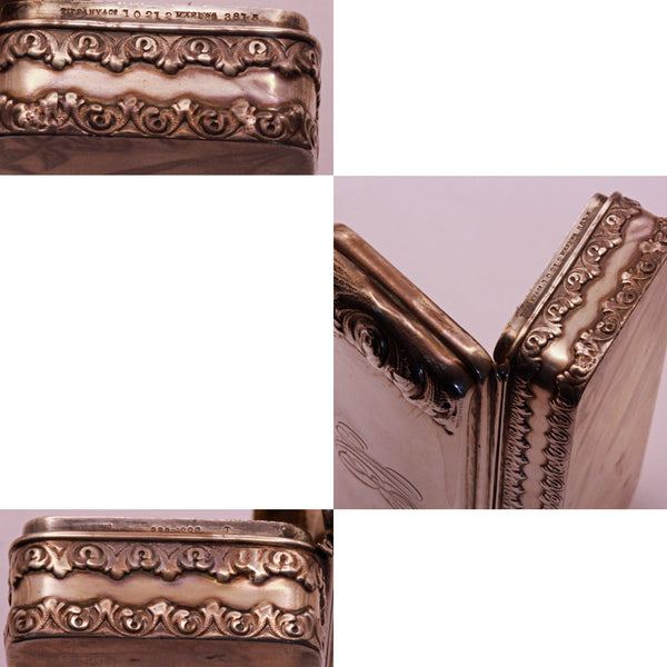 Marks and Metal: hallmarked on the ridged edge where the lid catches it: Right side engraved STERLING 925-1000 and letter 'T'. The letter T indicates 1891 - 1902.