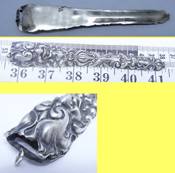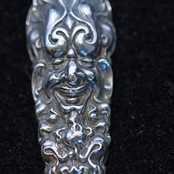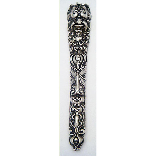 Triangular shaped, tapering towards the bottom. The entire top surface is richly embellished in repousse sterling silver with an open-mouthed mask or masqueron, typical of the Gothic era and Revived in the late Victorian period. Scrolling agricultural scene with details such as a sheath of corn displaying the richness of many kernels and at the bottom, a tiny acorn. Fleur des Lis, ribbons and scrolls in fine detail. An opening and loop at the back, make hanging the item from a hook or chatelaine possible.