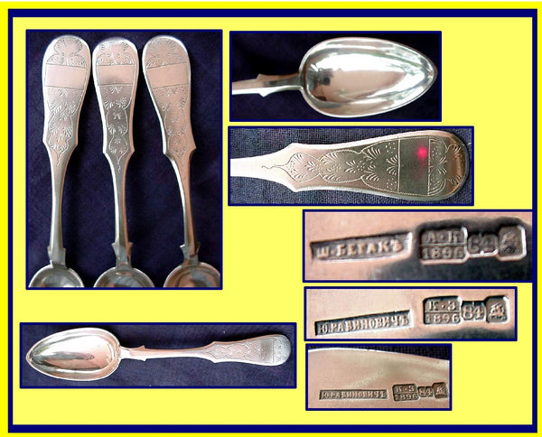 Russian hand engraved silver table or serving spoons made Moscow, Russia circa 1896.