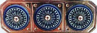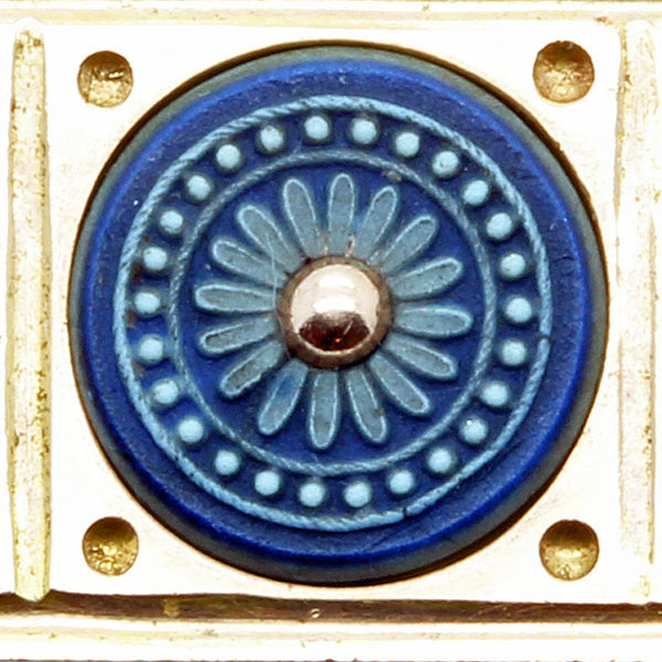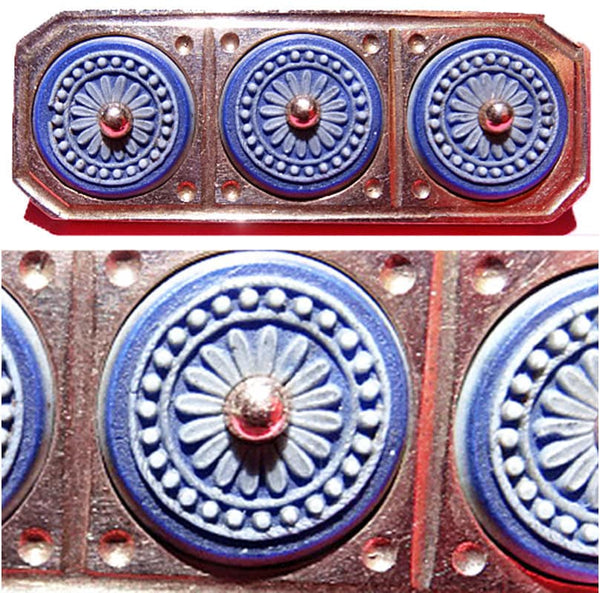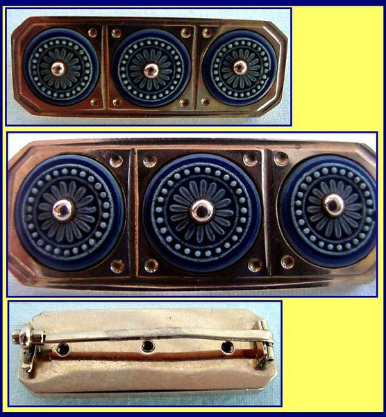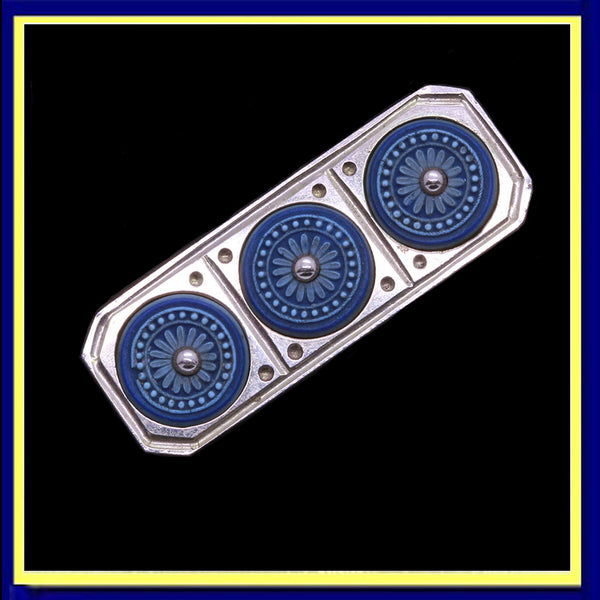 Simple engraved decoration divides pin into 3 sections and forms border along the edge. Each section is set with a 3 colour Wedgwood round plaque - white, sage green and dark blue.