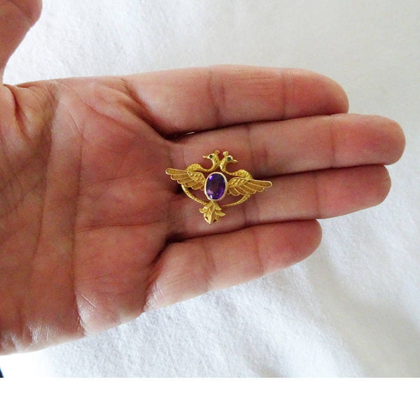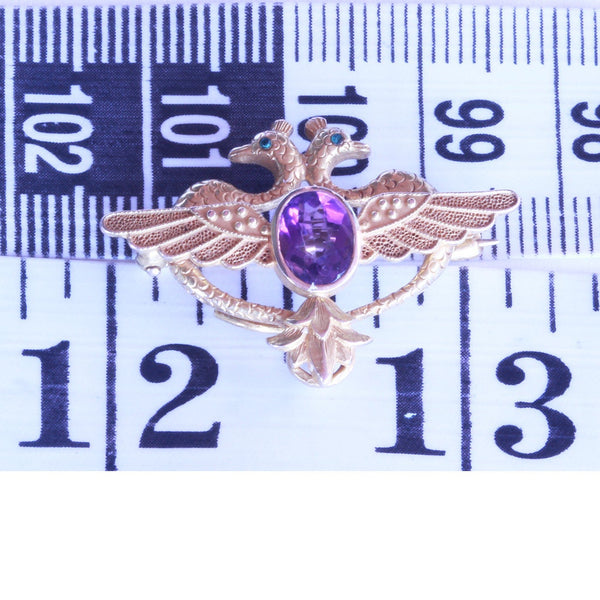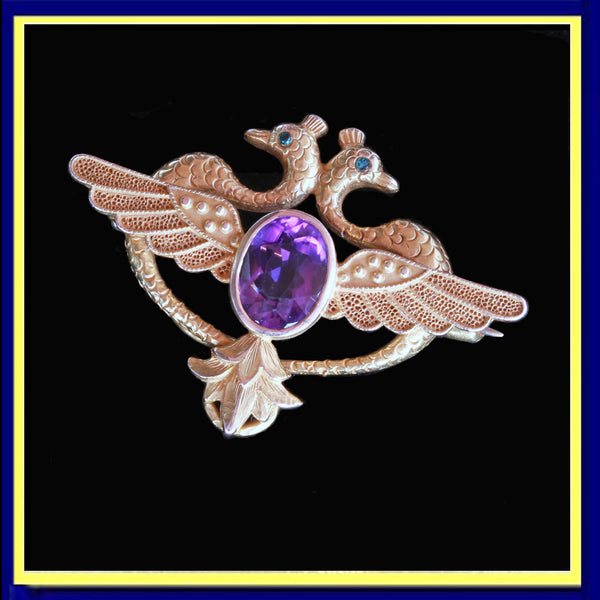 Description : Brooch or hanging enhancer / pendant that can be attached to a chain or necklace by a twisted long loop. Small but beautiful brooch with many features of the late 19th century / Art Nouveau and Etruscan Revival jewelry. A pair of peacocks face away from each other. They are superimposed by a pair of long wings and their bodies morph into rings of gold, much like mermaids in Art Nouveau jewelry. A lotus flower forms the terminal at the bottom of the brooch. The pair of wings is separated by an oval amethyst of a deep purple that contrasts strongly with the bright yellow of the gold metal. The eyes of the peacocks appear to be emeralds, but are too small to test.