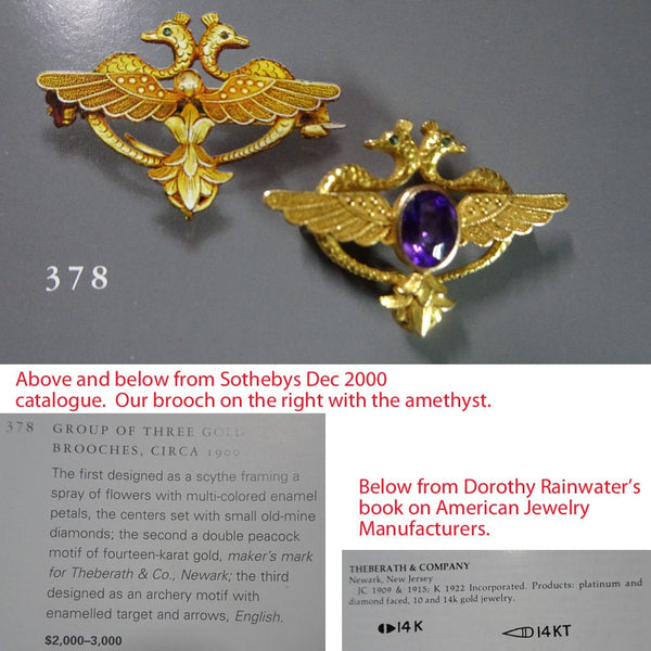 Maker: We found a double peacock brooch identical to this one with the exception that it does not have the amethyst in the center. All other details appear identical. It was part of lot 378 of Sothebys Dec 6 and 7 2000 auction of Important Jewels, in New York. Their brooch was attributed to Theberath & Co., Newark. We looked up the maker's mark for Theberath & Co in American Jewelry Manufacturers by Dorothy Rainwater and it is clearly not the same as our brooch.