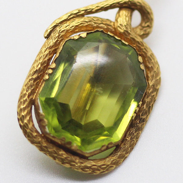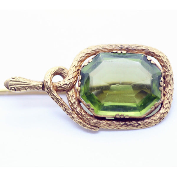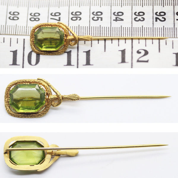 A hexagonal shaped peridot, worthy of a royal parure centers this magnificent tie pin. Colette set mount encircled by the body of a scaly snake that winds around itself and then dives down to parallel the pin at the back. Beautifully made in the style and period of Faberge.