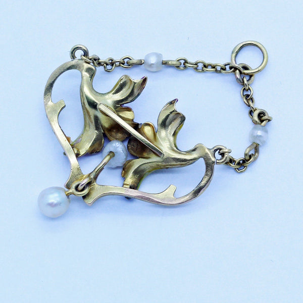 Description : A pair of trumpet shaped flowers face one another in a very organic design. They are supported by a gold scrolling, heart-shaped frame with modelled foliage and twigs. Small pearls form accents between the two flowers and an additional pearl drop swings at the bottom of the pendant. Flowers are a golden yellow on the outside and red inside. A pair of loops connects converging chains with small pearl accents. Very typical of the Art Nouveau design. Highly wearable.