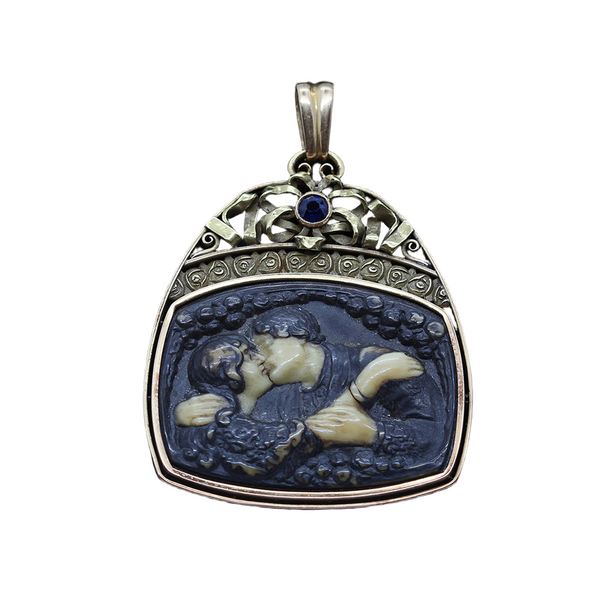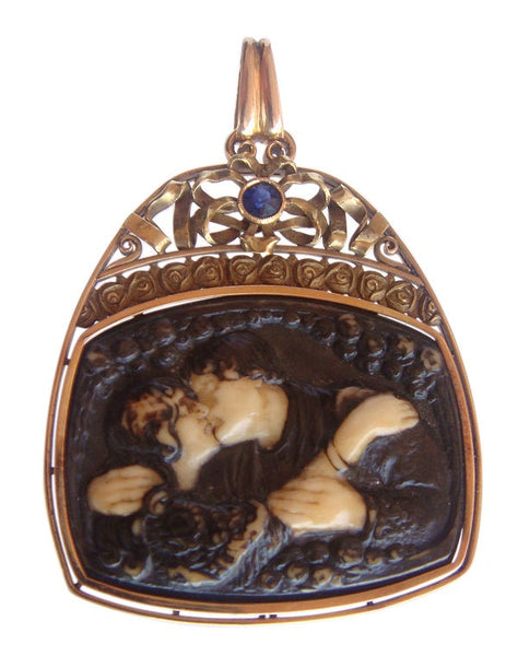 Rectangular at the bottom with an arch over the upper half. A sturdy, wide loop suspends an openwork, sculpted design of scrolling ribbons in gold with a bow in the center. The gold is set with a sapphire. Intricate and very interesting design. Below this is an arc of roses also made of solid gold , set between two arching gold banded borders. A rounded rectangle, buckle-shape constitues the lower, larger part of the pendant. It is set with a 'natural material' relief carving of a pair of lovers embrasing and kissing. The influence of the Pre-Raphaelite movement is clear in the flowing locks of the woman and the monkish, Renaissance style haircut of the youth. The couple is surrounded by carved flowers. They are clearly absorbed in their inner, personal reverie - eyes closed and arms twined around each other in a totally self-contained universe. Fine detail of the carving, both of the couple and the surrounding flowers, which are echoed in the floral, wide sleeve and her scrolling, flowing hair.