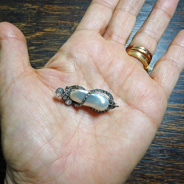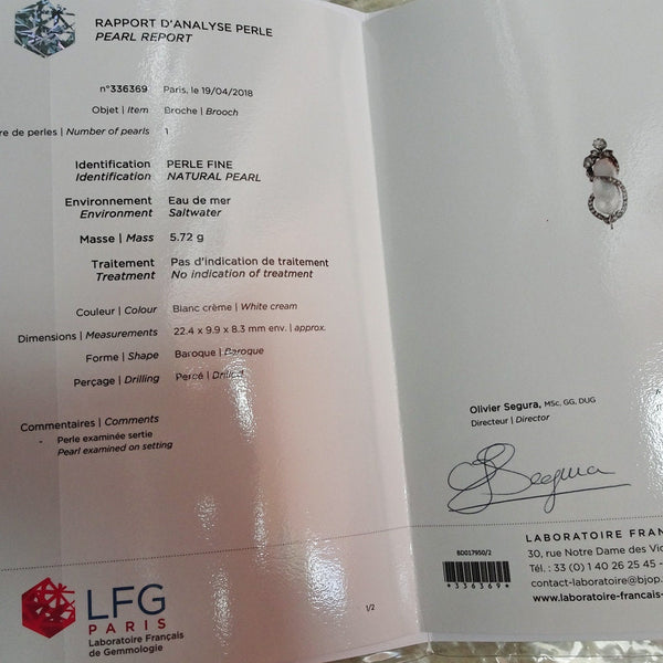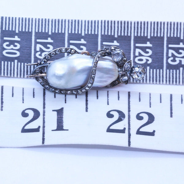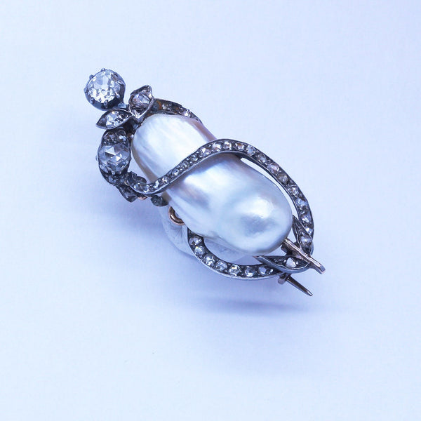 Antique Victorian Napoleon III brooch. 18k gold, silver, diamonds and a large, baroque natural pearl. Made in France, 19th century. Accompanied by certificate LFG no. 336369 of 19/4/2018 (French Gemological Society).
